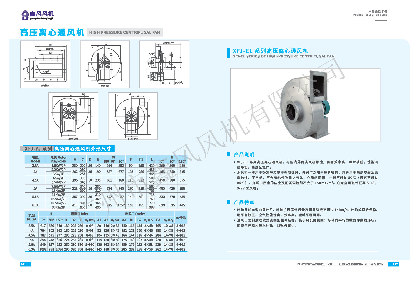 產(chǎn)品簡介: XFJ-EL系列高壓離心通風(fēng)機(jī)可取代低率8-18、9-27型風(fēng)機(jī)。